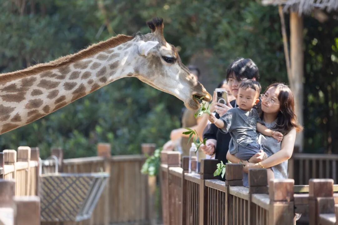 10月6日,小朋友在上海野生动物园与长颈鹿互动。新华社记者 王翔 摄