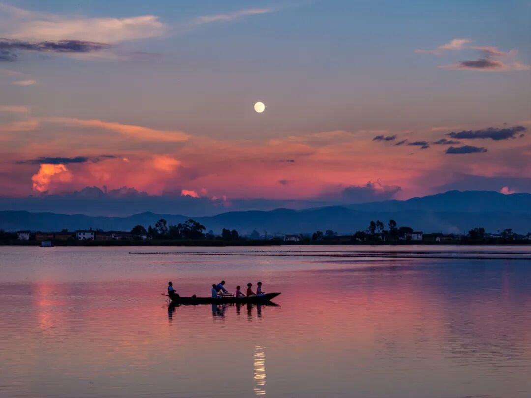 10月6日,人们乘船在云南大理洱源西湖赏月(无人机照片)。新华社发(罗新才 摄)