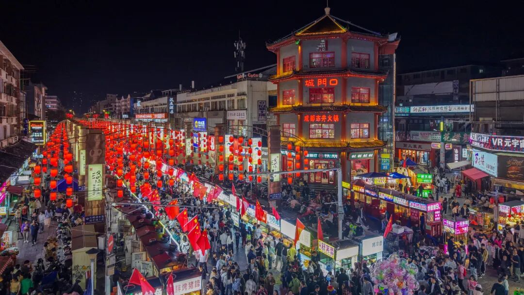 10月2日夜,河南省洛阳市老城区十字街游人如织(无人机照片)。新华社发(李卫超 摄)