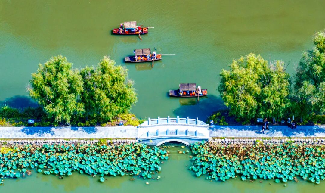 10月7日,游客在江苏兴化里下河国家湿地公园乘船游玩(无人机照片)。新华社发(周社根 摄)