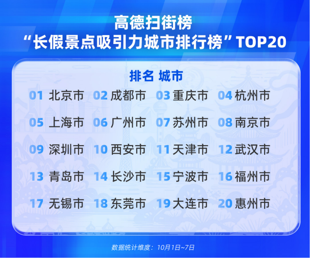 大城市拥有丰富的资源、便利的交通和强大的接待能力,依然是公众长假出游的主要选择。全国《长假景点吸引力城市排行榜》的前20名依次是:北京、成都、重庆、杭州、上海、广州、苏州、南京、深圳、西安、天津、武汉、青岛、长沙、宁波、福州、无锡、东莞、大连、惠州,均为一线和二线城市。