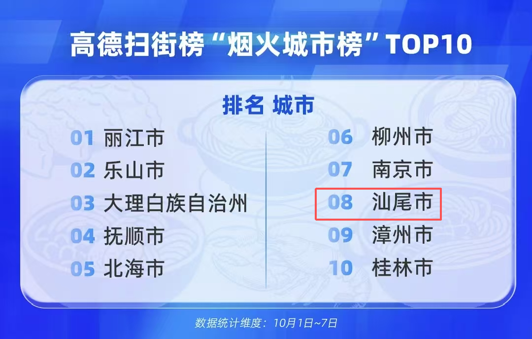 10月9日,新华社联合高德扫街榜发布《奔腾的中国——2025国庆中秋长假出行消费报告》,汕尾上榜“高德扫街榜 烟火城市榜”TOP10。具体报道详情如下: