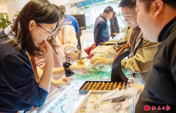 展区内,来自汕尾的优质海产品、精致珠宝首饰、特色农产品及文旅创意产品集中亮相,每一件都承载着汕尾的自然馈赠与匠人之心。北京市民及游客穿梭于各展位间,或细细品味海产品干货的鲜香,或欣赏珠宝的璀璨工艺,或购买富有特色的鲜果及饮料,对“汕尾味道”与“汕尾制造”交口称赞。