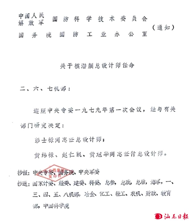 中国核潜艇首位总设计师任命文件首次公开(图片来源:中国核动力研究设计院)。