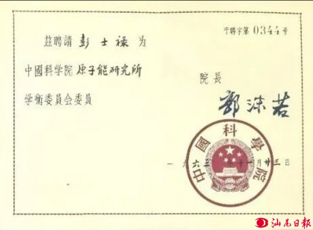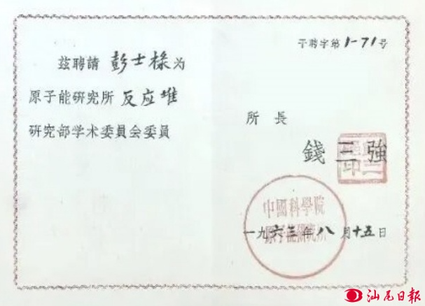中国科学院聘书、中国科学院原子能研究所聘书、中国科学技术大学聘书,记载彭士禄在重要科研与教育机构任职、从事学术与人才培养工作的经历(图片来源:中国核动力研究设计院)。