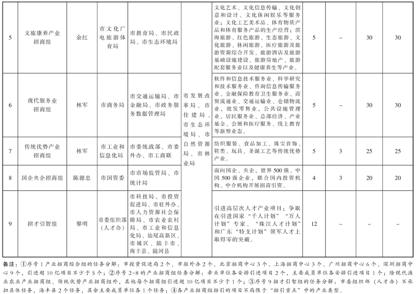 1. 完善运行机制。调整汕尾市招商引资工作领导小组,统一领导、指挥、调度全市招商引资工作,按照“领导挂帅、部门牵头、区域主体”原则,协调解决招商引资项目在引进、推进过程中存在的困难和问题,形成领导带头抓产业、部门联动推项目的工作格局。