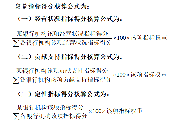 单个银行机构(第一至三名)分存额=当期可分存的财政性存款额×70%×(单个银行机构在银行业金融机构评价得分/第一至三名银行机构在银行业金融机构评价得分之和)。单个银行机构(其余名次)分存额=当期可分存的财政性存款额×30%×(单个银行机构在银行业金融机构评价得分/其余名次银行机构在银行业金融机构评价得分之和)。
