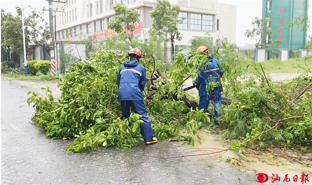 “桦加沙”过境红海湾时,风雨浪潮叠加,威力惊人。国道、省道沿线树木倒伏,断枝残骸遍布;连岛路围挡被毁,安全隐患凸显。灾情就是命令!经开区应急管理局救援队伍顶风冒雨,第一时间携带清障工具赶赴现场,对G236、S241等主干道倒伏树木进行切割清运,对破损围挡进行加固封闭。经开区消防救援大队16名指战员连续作战,清理障碍百余处,徒手疏通堵塞下水道,全力保障“生命通道”畅通与排水正常。狂风暴雨中,“火焰蓝”与“应急橙”的身影,成为让群众安心的守护色。