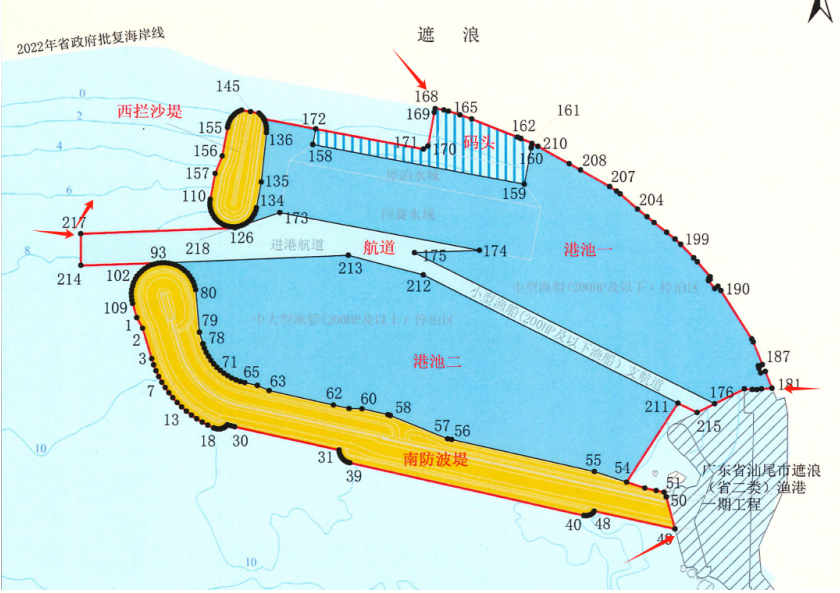 第五条 渔港主要座标点北起东经115°33´10.045″北纬22°40′17.958″、南至东经115°33´31.079″北纬22°39′47.313″、东至东经115°33´33.378″北纬22°39′59.371″、西至东经115°32´46.882″北纬22°40′9.992″港界范围内所属的陆域和水域。(具体渔港范围详见附件1、附件2)。