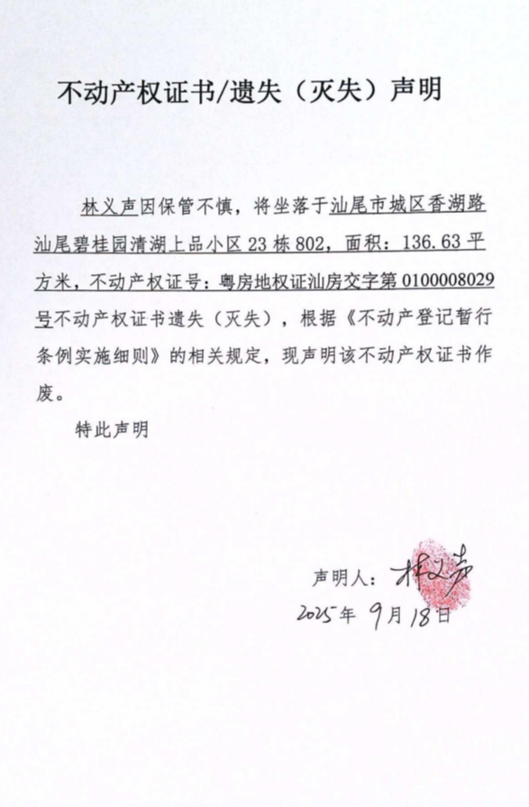 不动产权证书遗失(灭失)声明(林义声)