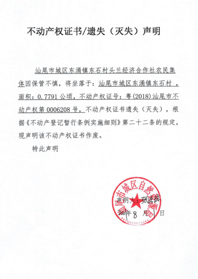 不动产权证书遗失(灭失)声明(东石村头兰经济合作社农民集体)