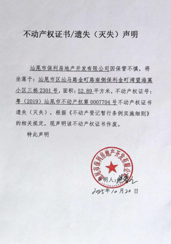 不动产权证书遗失(灭失)声明(汕尾市保利房地产开发有限公司)