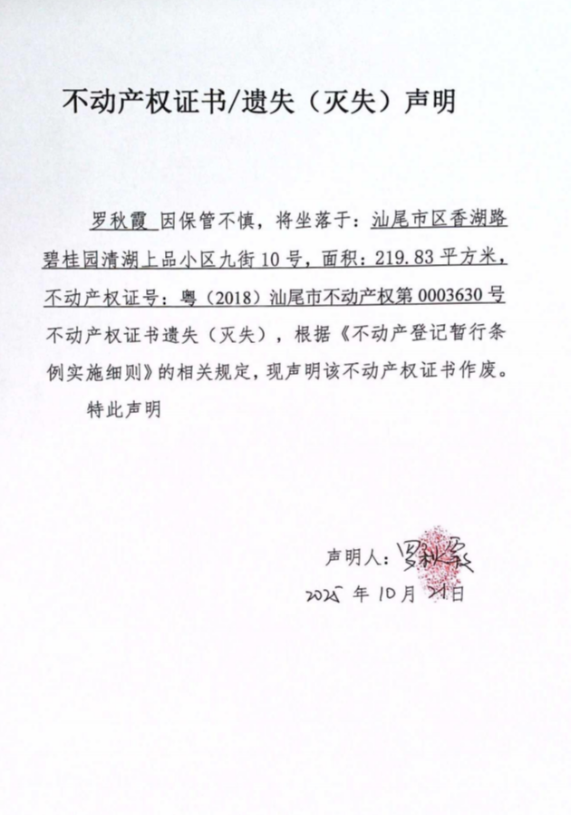不动产权证书遗失(灭失)声明(罗秋霞)