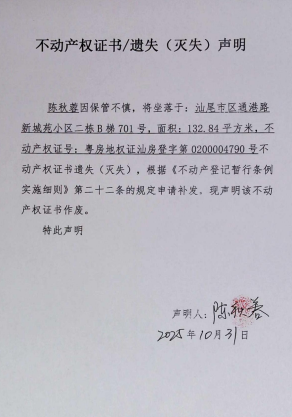 不动产权证书遗失(灭失)声明(陈秋蓉)