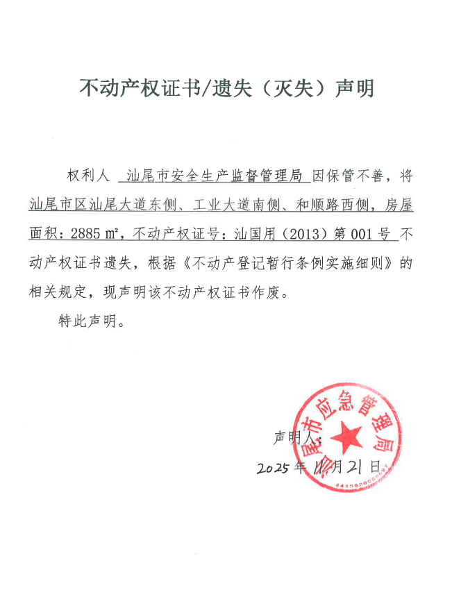 不动产权证书遗失(灭失)声明(汕尾市安全生产监督管理局)