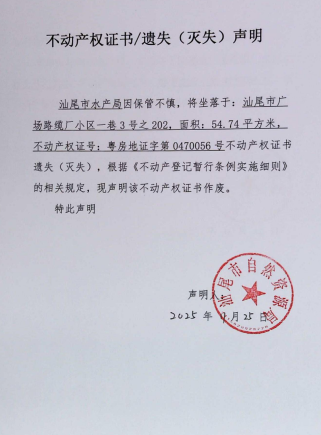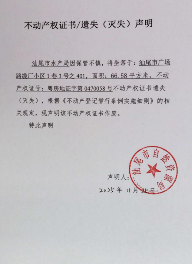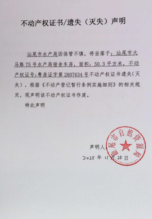 不动产权证书遗失(灭失)声明(汕尾市水产局共3宗)
