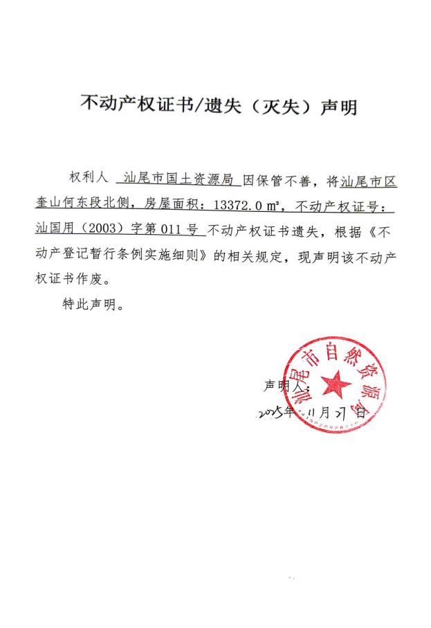 不动产权证书遗失(灭失)声明(汕尾市国土资源局)
