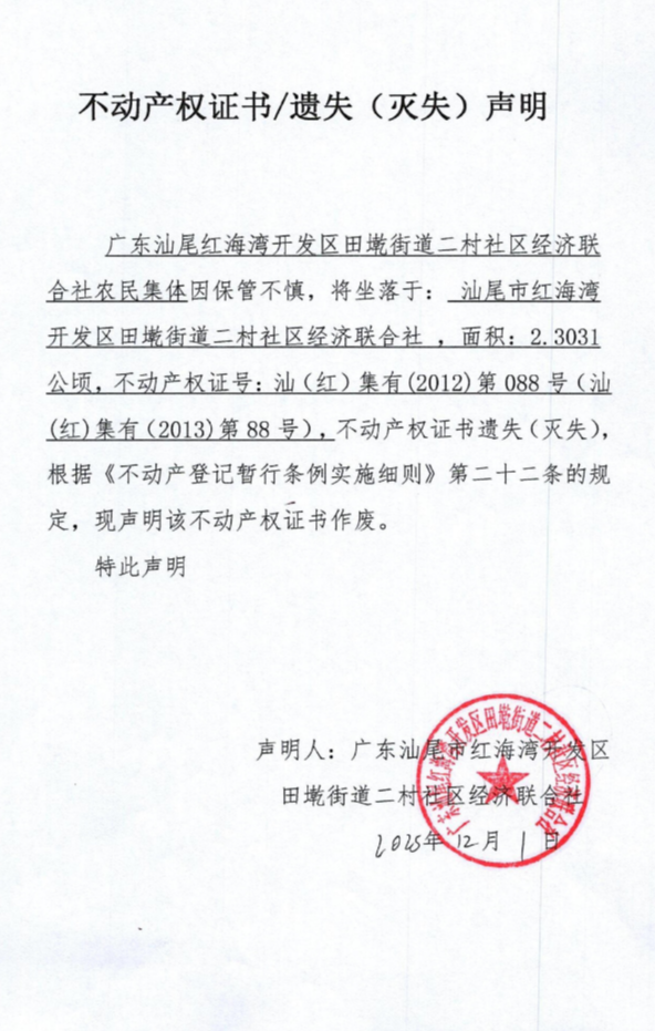 不动产权证书遗失(灭失)声明(广东汕尾红海湾经济开发区田墘街道二村社区经济联合社农民集体)