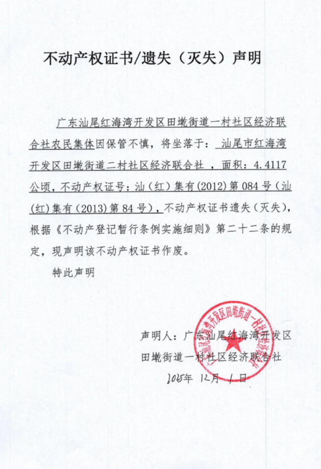 不动产权证书遗失(灭失)声明(广东汕尾红海湾开发区田墘街道一村社区经济联合社农民集体)