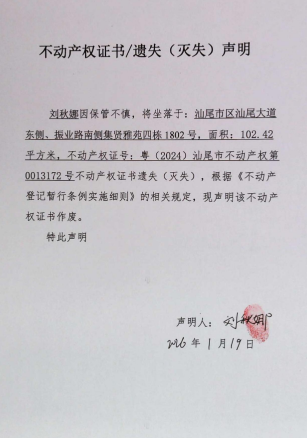不动产权证书遗失(灭失)声明(刘秋娜)