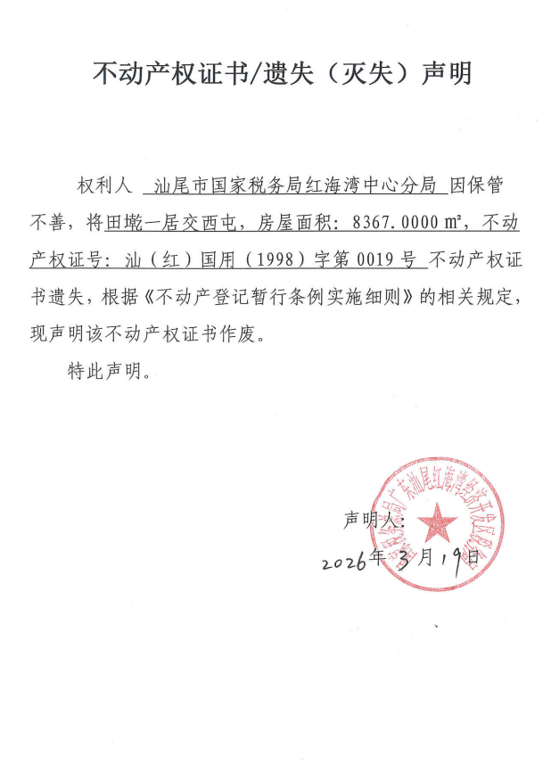 不动产权证书遗失(灭失)声明(汕尾市国家税务总局红海湾中心分局)