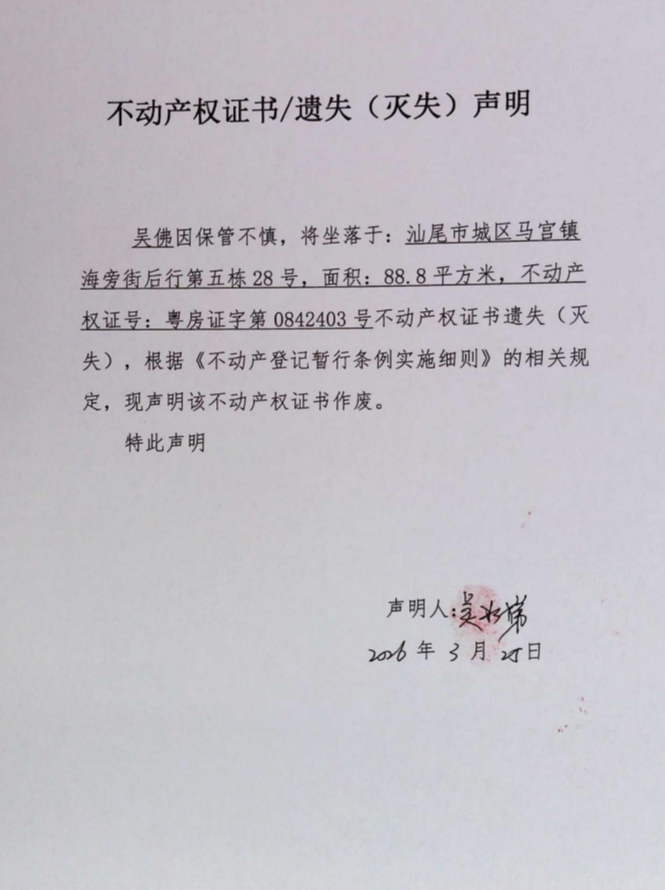 不动产权证书遗失(灭失)声明(吴佛)