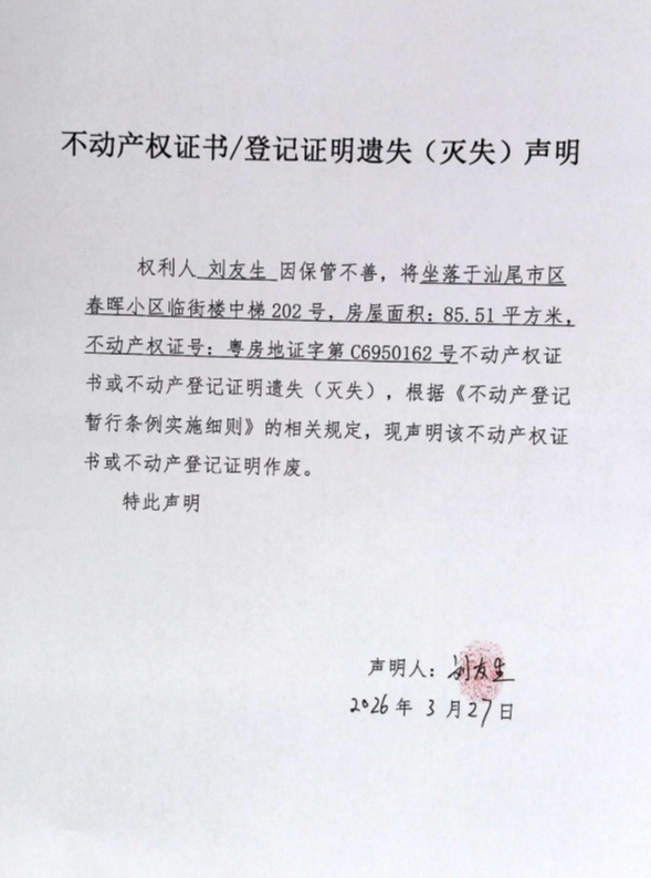 不动产权证书遗失(灭失)声明(刘友生)