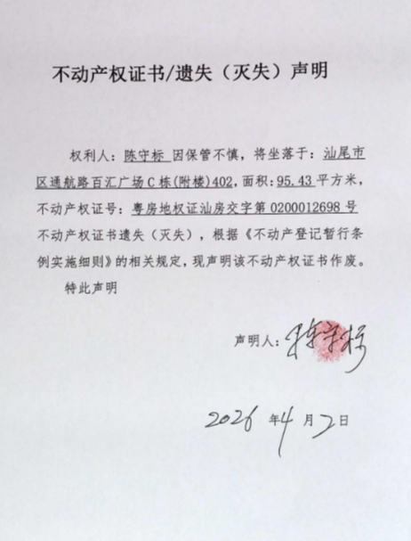 不动产权证书/遗失(灭失)声明(陈守标)