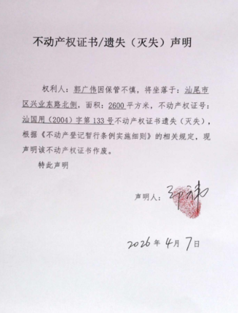 不动产权证书/遗失(灭失)声明(郭广伟)