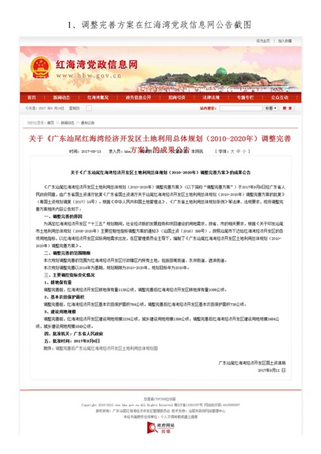 广东汕尾红海湾经济开发区各街道土地利用总体规划(2010-2020年)于2011年3月22日经汕尾市人民政府批准,并在各街道办事处政务公开栏进行公示。