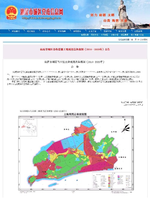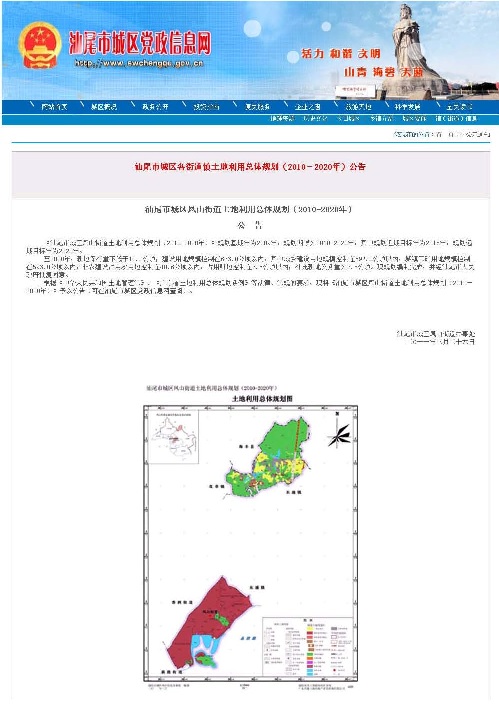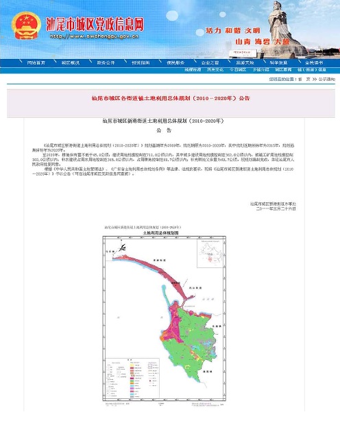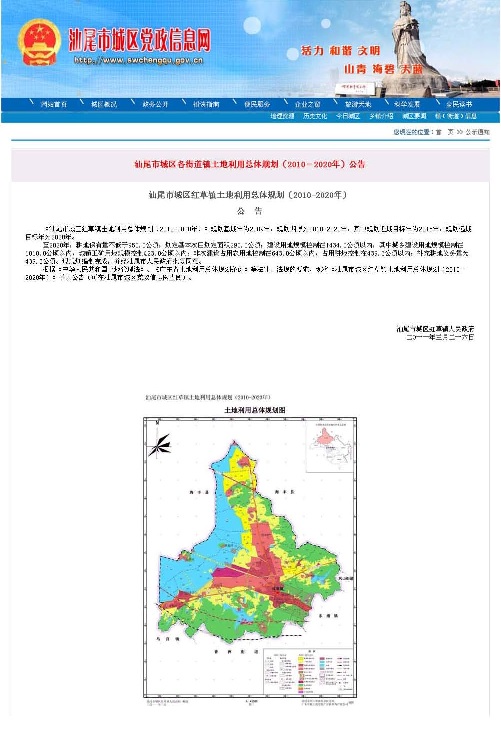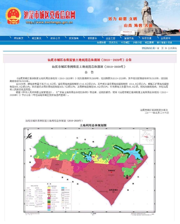 汕尾市城区各镇(街道)土地利用总体规划(2010-2020年)于2011年3月22日经汕尾市人民政府批准,并于网上进行公示。