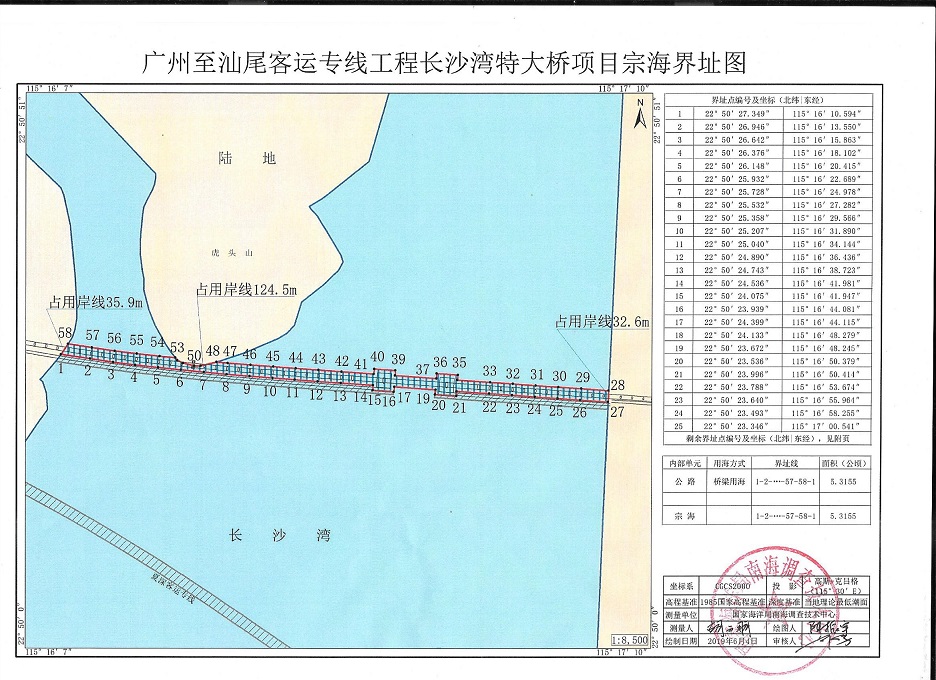 广东广汕铁路有限责任公司拟在市城区红草镇和海丰县梅陇镇之间建设广州至汕尾客运专线长沙湾特大桥项目,项目位于厦深铁路跨海大桥以北约750m,东西向跨越长沙湾海域。项目涉及用海分为大桥主桥和临时施工栈桥,其中大桥主桥申请用海面积5.3155hm2,大桥跨海段长度1564.61m,主桥占用人工岸线193米,主桥用海年限40年;临时施工栈桥申请用海面积3.0950hm2,用海年限3年。用海性质为公益性,用海类型为交通运输用海中的路桥用海,用海方式为构筑物中的跨海桥梁用海(具体范围见附图)。有关事宜公示如下: