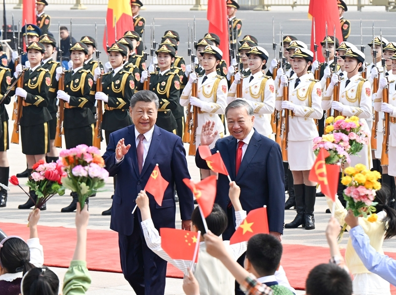 4月15日上午,中共中央总书记、国家主席习近平在北京人民大会堂同来华进行国事访问的越共中央总书记、国家主席苏林举行会谈。这是会谈前,习近平在人民大会堂东门外广场为苏林举行欢迎仪式。新华社记者 燕雁 摄