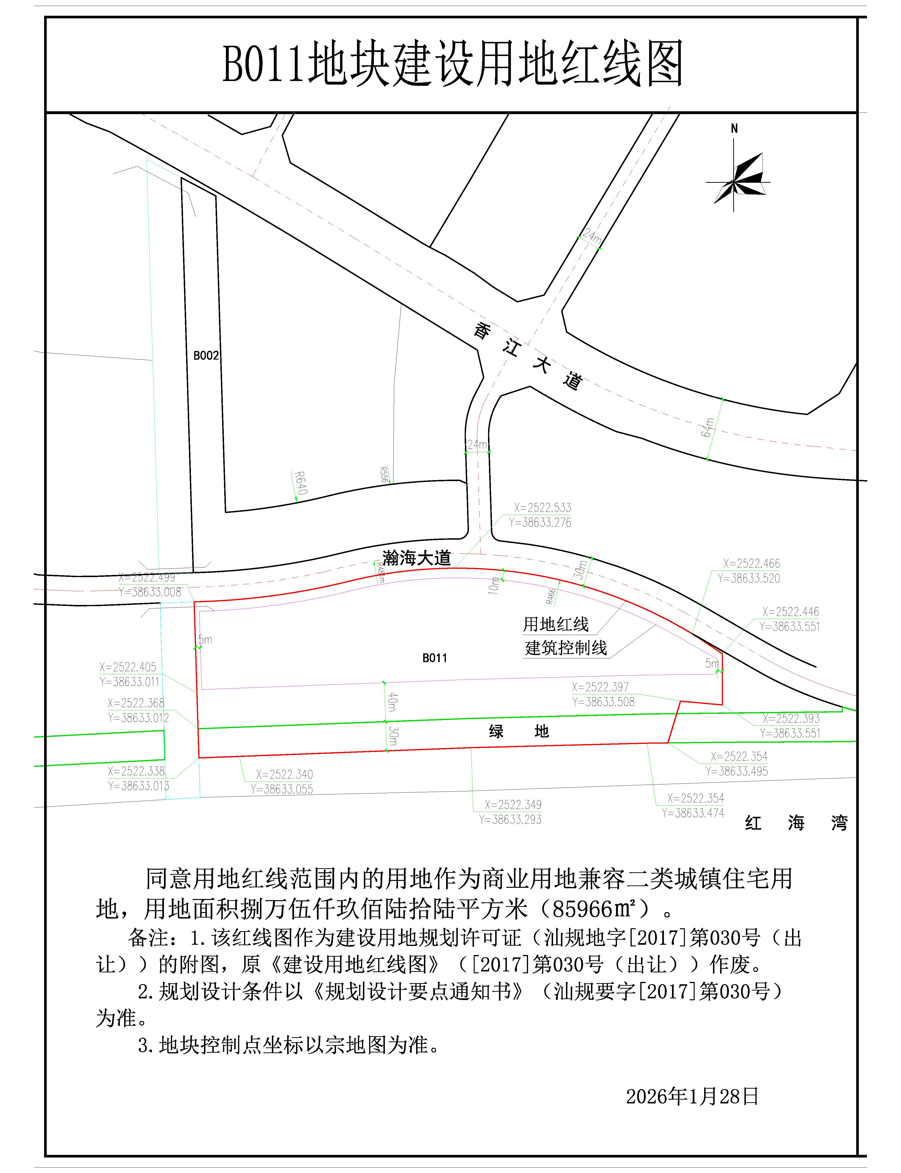 土地用途:B002和B005地块商业用地;B011地块商业用地兼容30%二类城镇住宅用地。