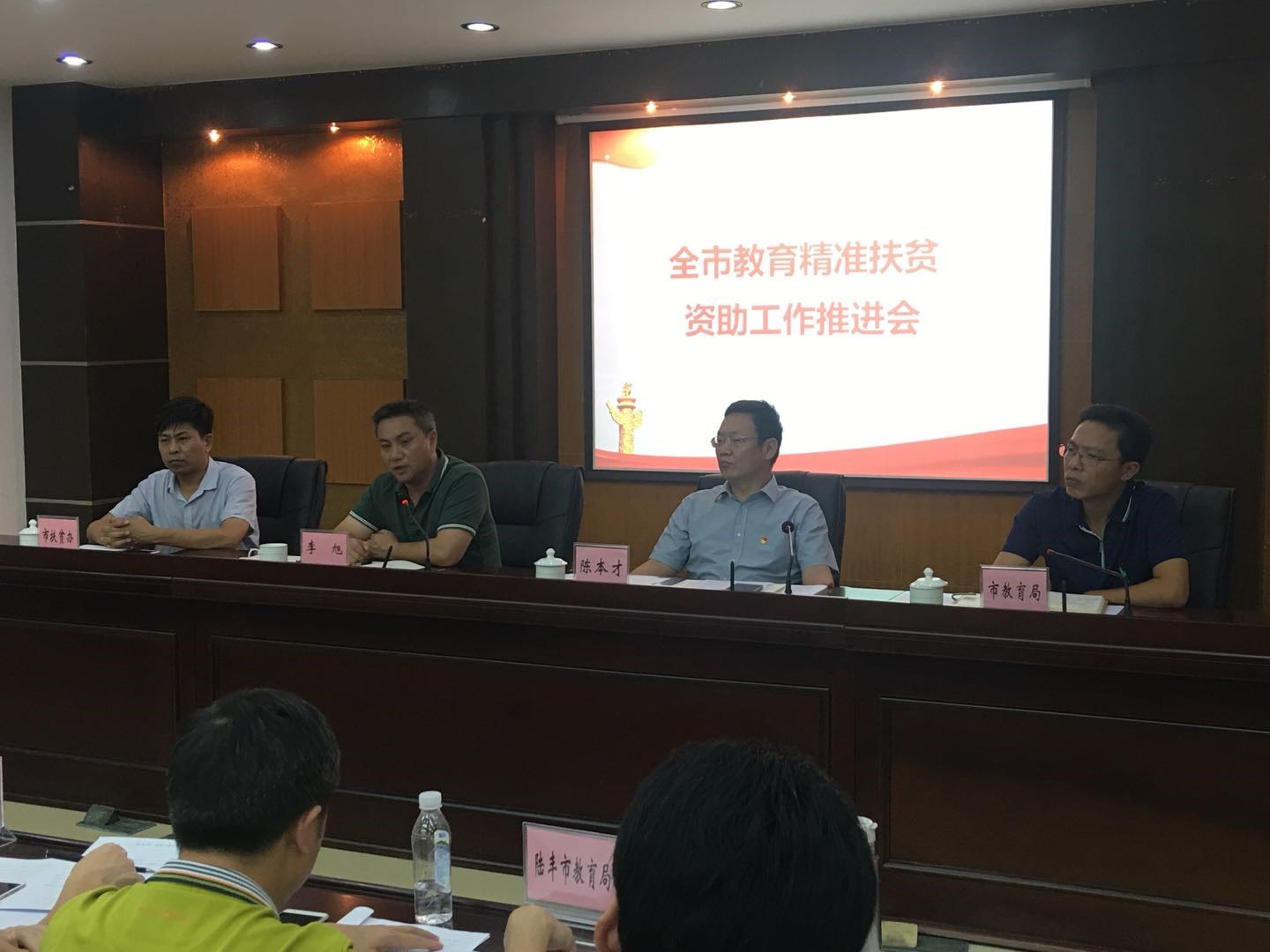 7月30日,市教育局、市扶贫办联合在汕尾市教育局一楼会议室召开全市教育精准扶贫学生资助工作推进会,深入学习贯彻习近平总书记关于脱贫攻坚重要指示批示精神,认真贯彻落实全市打赢脱贫攻坚战工作推进会精神,部署全市教育精准扶贫工作。