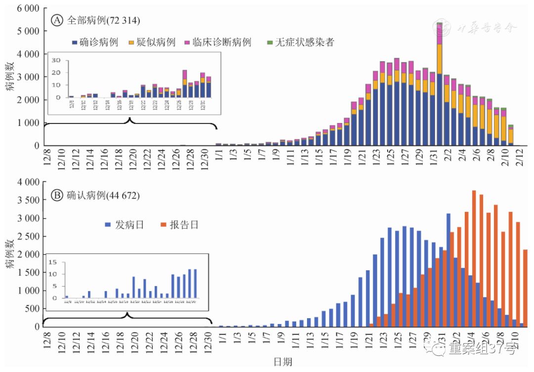 ▲截至2020年2月11日新型冠状病毒肺炎确诊病例报告日期、发病日期流行曲线。图片来自《中华流行病学杂志》网站