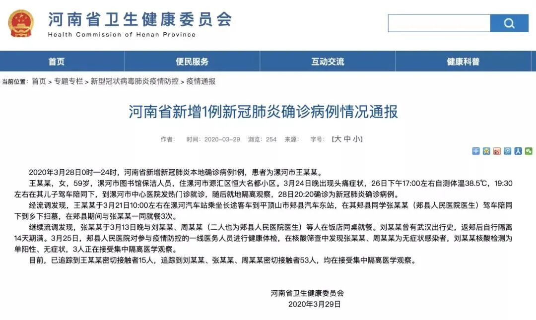 2020年3月28日0时—24时,河南省新增新冠肺炎本地确诊病例1例,患者为漯河市王某某。