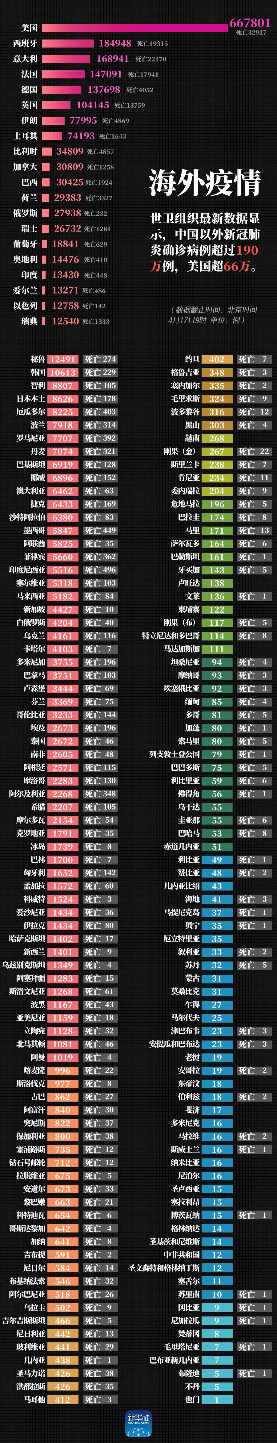 据美国约翰斯·霍普金斯大学发布的全球新冠肺炎数据实时统计系统,截至4月17日6时38分,全美共报告新冠肺炎确诊667225例,死亡32868例。在过去24小时,全美新增确诊23288例,新增死亡4246例。数据显示,16日美国单日死亡人数创下了新高。