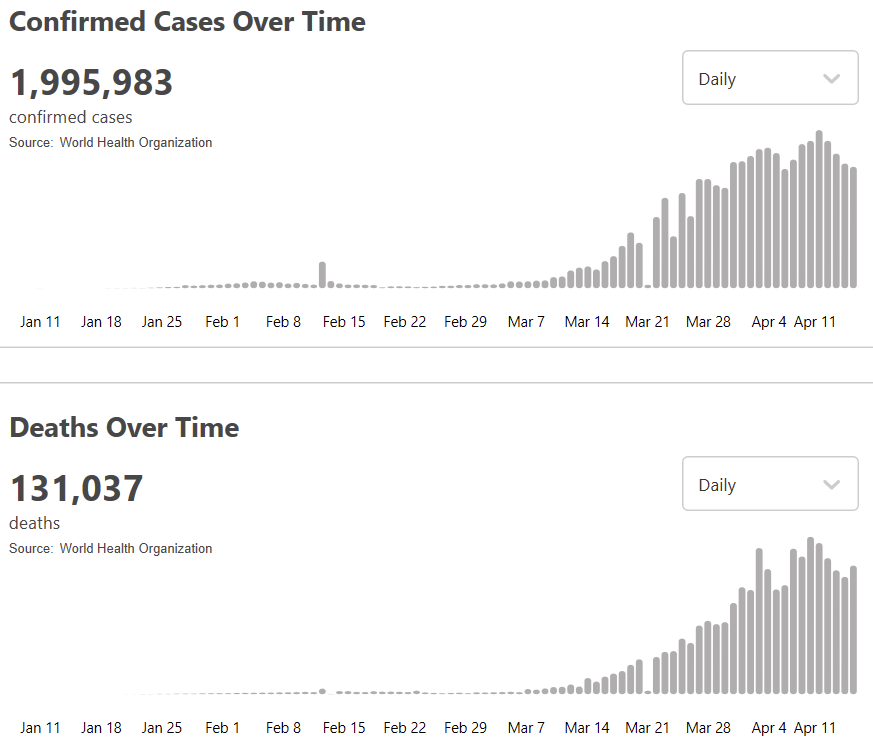 据美国约翰逊·霍普金斯大学统计,截至北京时间16日晚,全球新冠肺炎确诊病例累计超过207万例,死亡逾13.8万例。