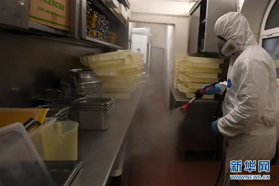▲4月22日,在意大利首都罗马,工作人员为餐厅消毒。新华社发(埃丽萨·林格利亚 摄)