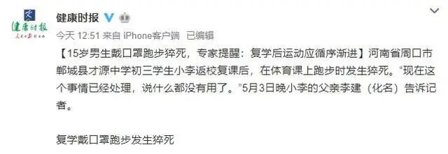 据媒体报道,河南省周口市郸城县才源中学初三学生小李返校复课后,在体育课上跑步时发生猝死。据报道,小李当时在学校跑步佩戴了普通口罩。家属表示医院出具死亡证明是猝死,但是他们认为戴口罩跑步才是小李死亡的“诱因”,当时气温有20℃。