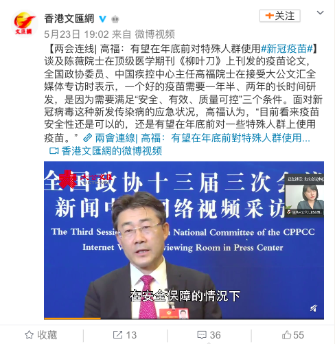 高福:有望在年底前,对特殊人群使用新冠疫苗
