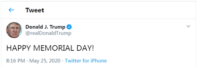 特朗普发推“阵亡将士纪念日快乐”