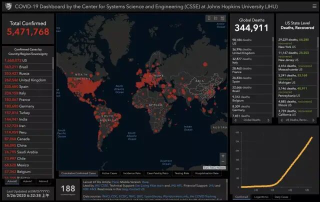 据美国约翰斯·霍普金斯大学发布的数据,截至美国东部时间5月25日晚6时,全美共报告新冠肺炎确诊1660072例,死亡98034例。