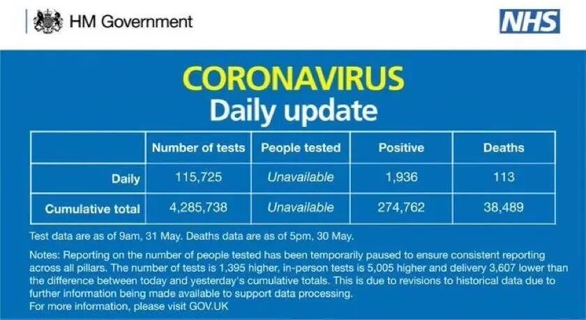根据英国卫生与社会保健部消息,截至当地时间5月31日9时,英国新冠肺炎确诊病例达274762例,单日新增1936例;截至5月30日下午5时,死亡病例38489例,单日新增113例。