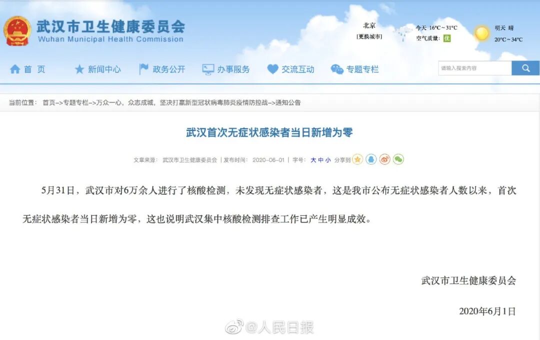 6月1日,武汉市卫健委发布公告称,5月31日,武汉市对6万余人进行了核酸检测,未发现无症状感染者,这是武汉市公布无症状感染者人数以来,首次无症状感染者当日新增为零,这也说明武汉集中核酸检测排查工作已产生明显成效。