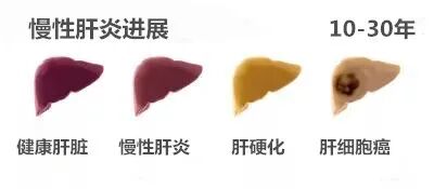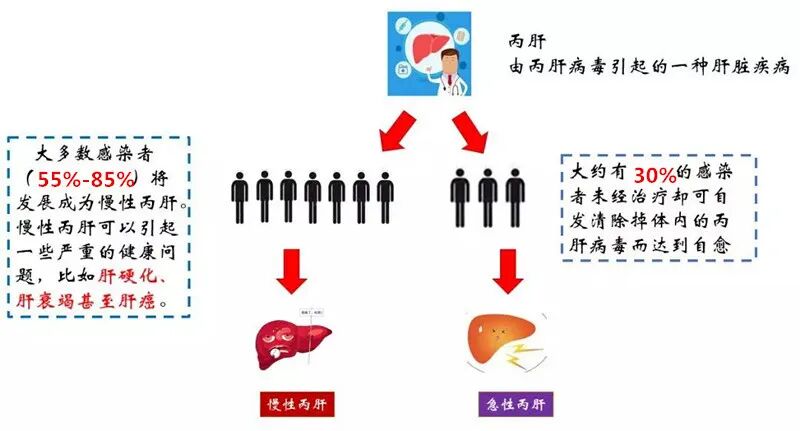 图:慢性肝炎的进展 慢性丙肝患者可能在很长一段时间内没有症状,有时甚至长达几年或几十年,但丙肝其实是一个“隐匿的杀手”。丙型肝炎病毒会缓慢而默默地损害肝脏,最终导致肝硬化和肝细胞癌。据世卫组织统计,在慢性丙肝患者中,20年内出现肝硬化的危险在15%和30%之间。