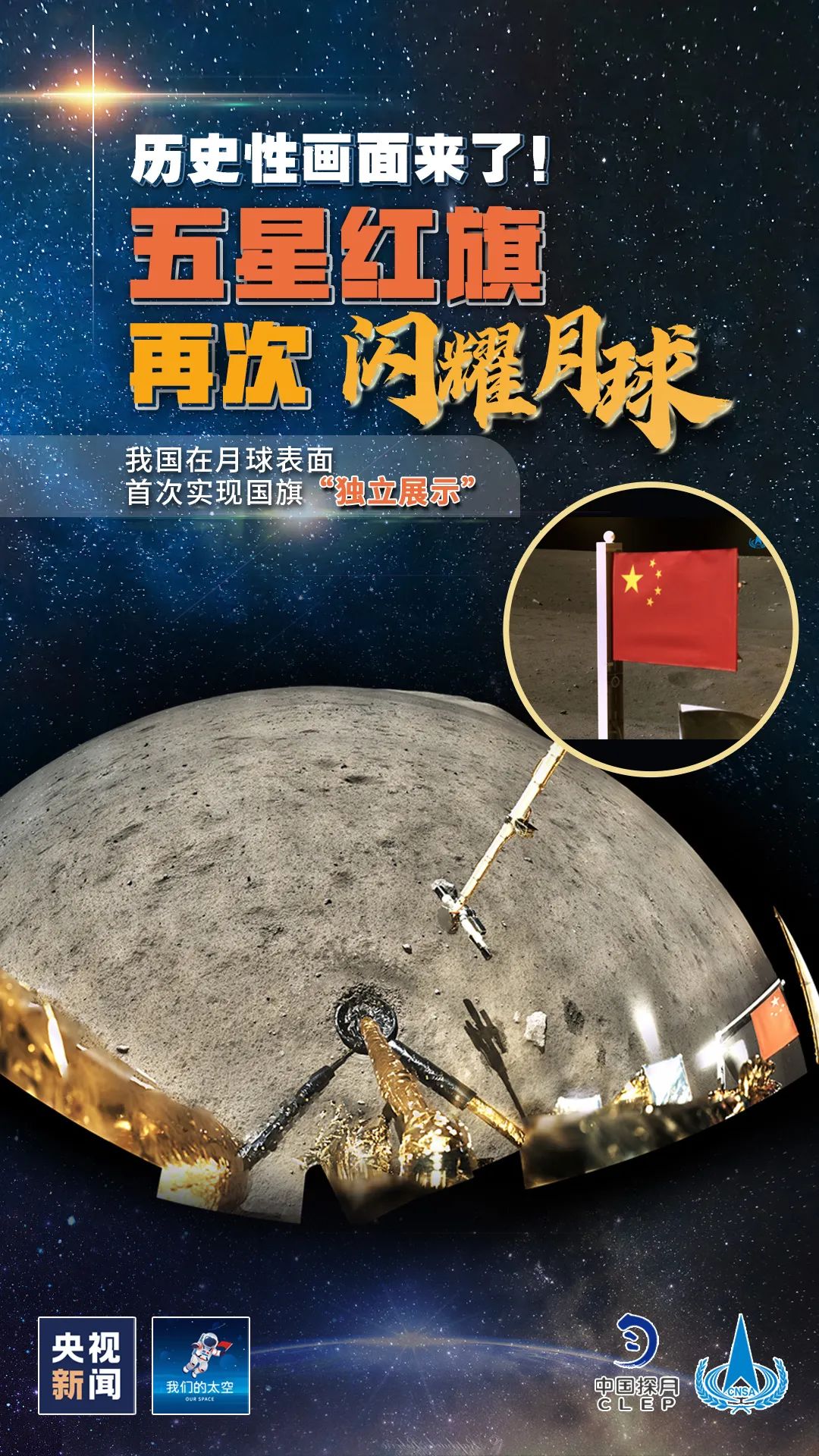 12月3日,嫦娥五号着陆上升组合体在点火起飞前,进行了月面国旗展开。此次国旗展开是我国在月球表面首次实现国旗的“独立展示”。