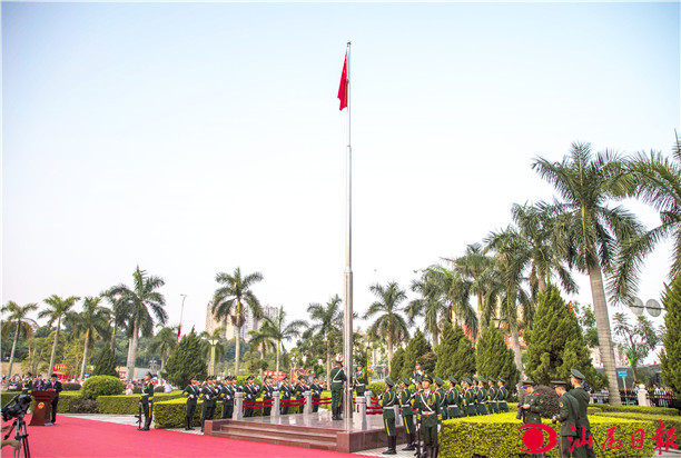 6时10分,市马思聪艺术中心广场上,大家精神饱满,面向升旗台整齐列队,等待升旗仪式举行。6时30分,升国旗仪式正式开始。由武警组成的国旗护卫队迈着整齐有力的步伐,昂首挺胸,护送鲜红的五星红旗走向升旗台。庄严雄壮的国歌响彻广场,升旗手振臂一挥,五星红旗迎风飘展,冉冉升起。在场人员神情庄重,面向国旗肃然而立,目光凝视鲜艳的五星红旗,伴着国歌齐声高唱,共同祝愿祖国更加繁荣昌盛、人民生活更加幸福美好。