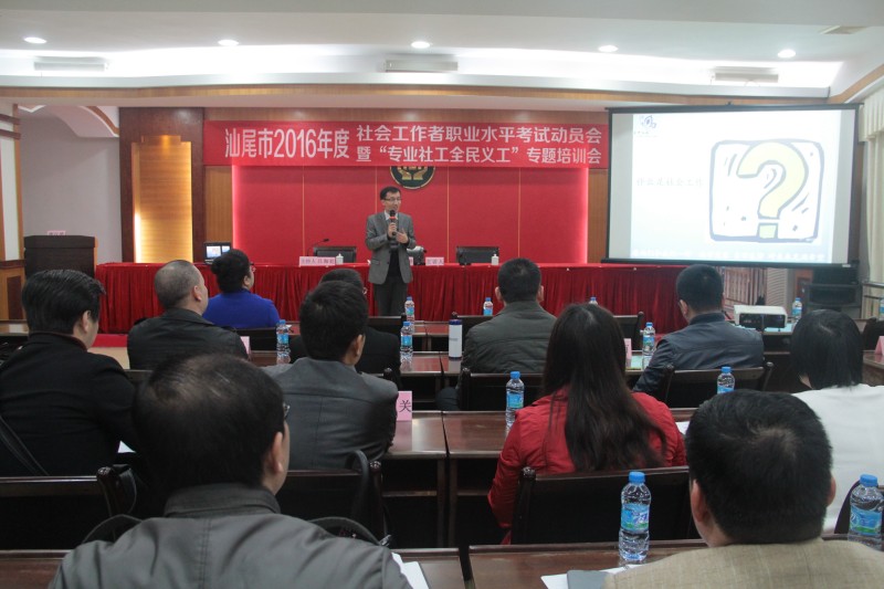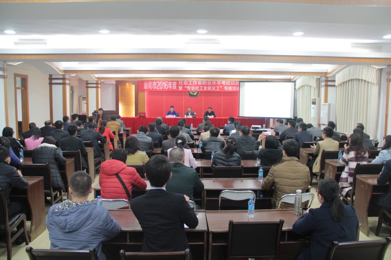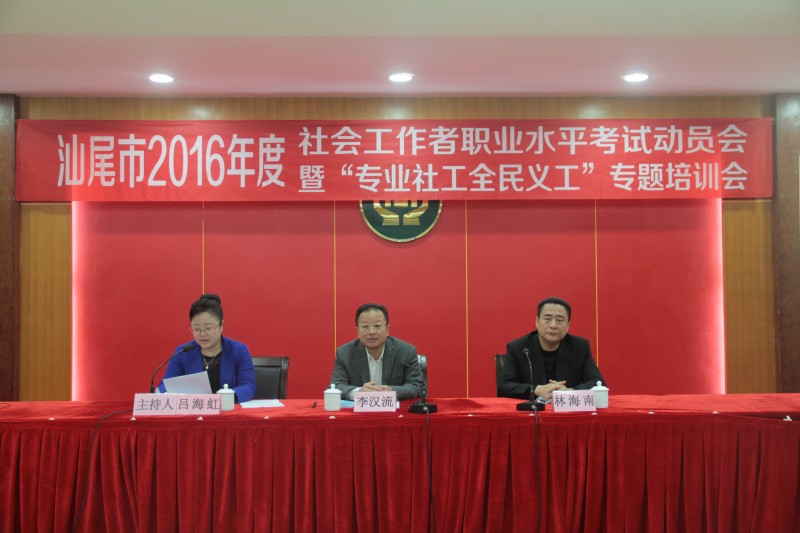 3月17日上午,市社工委、市民政局联合召开汕尾市2016年度社会工作者职业水平考试动员会暨“专业社工全民义工”专题培训会,学习贯彻中央、省、市关于加强社会工作人才队伍建设的文件精神,动员部署今年的社工考试工作,推进“专业社工全民义工”工作。市民政局党组书记、局长李汉流、市社工委专职副主任林海南出席会议并作了重要讲话;市民政局副局长吕海虹主持会议;各县(市、区)社工委专职副主任、民政局分管副局长及社工业务负责同志;市直有关单位负责同志以及市民政局全体干部职工等近100人参加了会议。